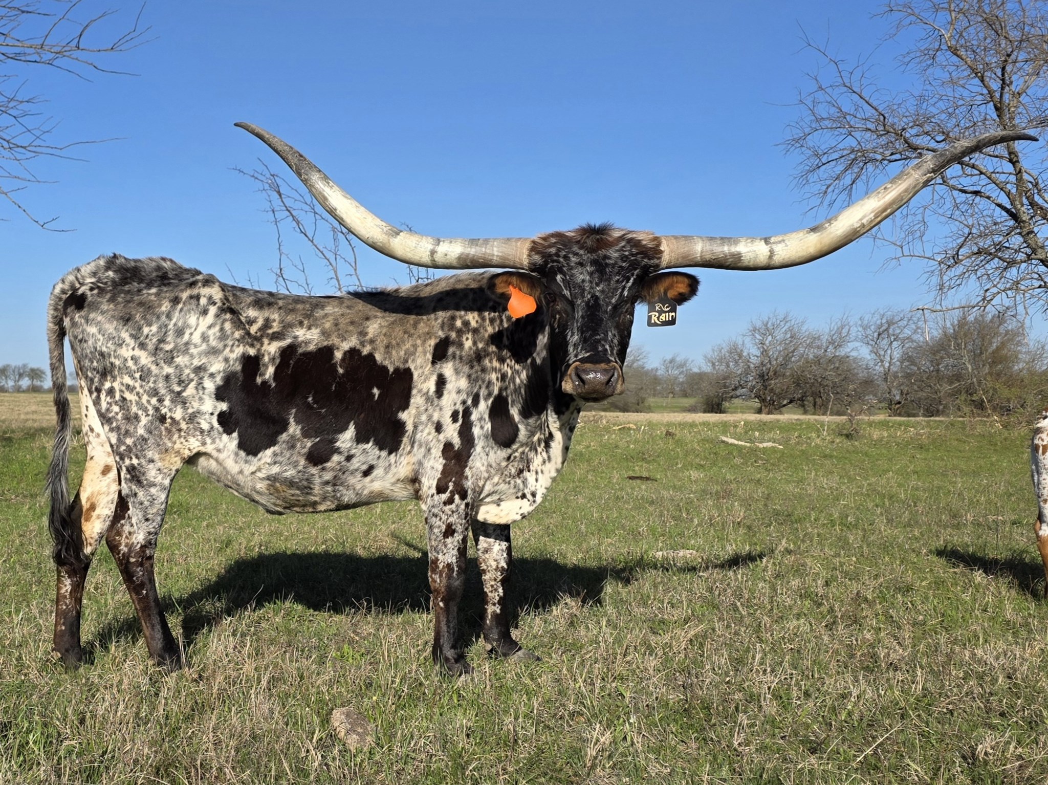 Meet Rain, she is the longest horn cow on the ranch measuring at 87 inches. She is a beautiful black and white that goes back to Super Bowl twice. She has given us 3 beautiful heifers in a row and would be a great outcross for all of todays bulls. She is about as good and pretty as they get.