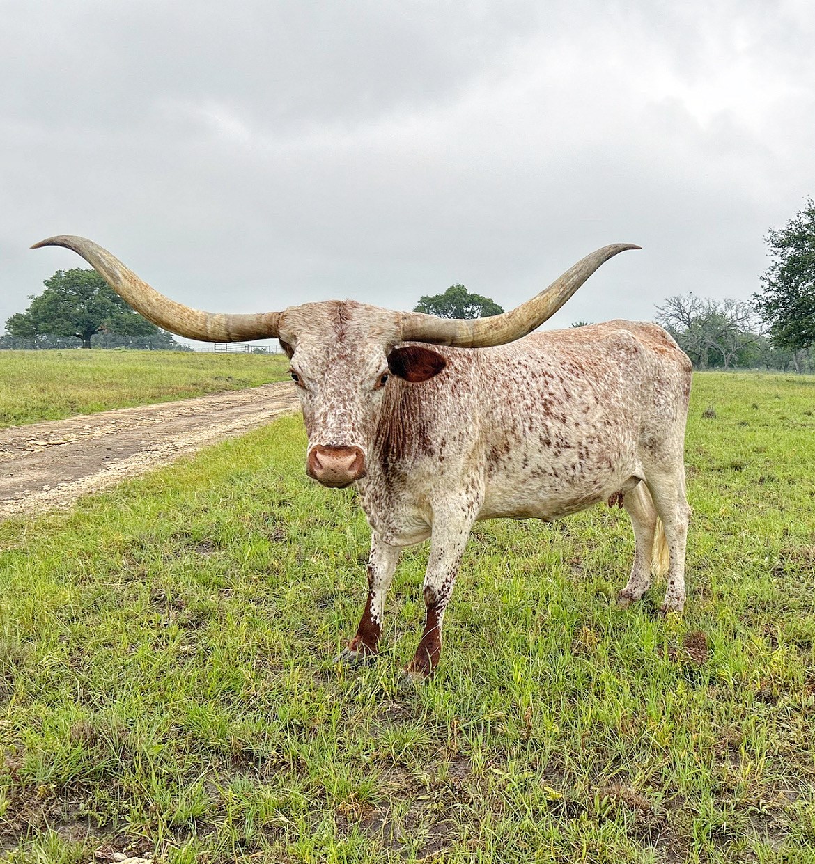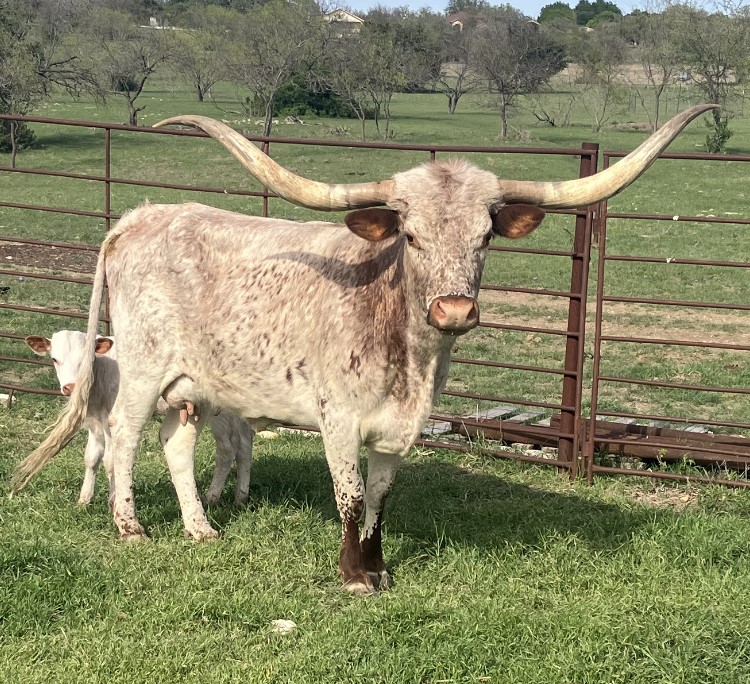 Best of Aces TM is out of the legendary Tom and Maurice Gibbs breeding program. She is out of the great Tempting TM and the 90+" Shiro Miss TM. This bloodline is known for exceptional mothering and characteristically twisty horn. She’s got a gorgeous heifer out of Goldmine 1 at side.